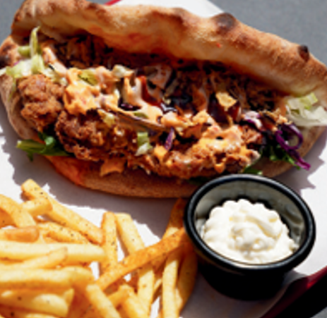 Çıtır tavuk kalçası, üstüne acılı mayonez, özel kokteyl sos, barbekü sos; yanında patates kızartması, kırmızı ...