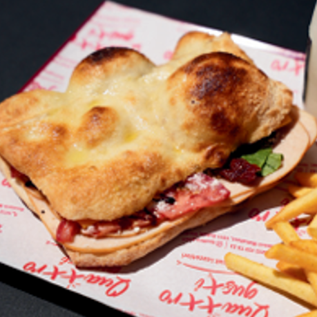 Hindi füme, pesto sos, mozarella peyniri, cheddar peyniri, taze roka, taze domates, balsemico. Patates kızartm...